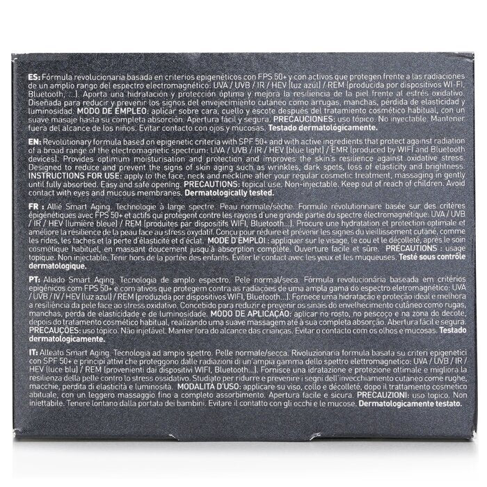 Based on epigenetic criteria with SPF 50+ & active ingredients that protect against radiation from a wide range of the electromagnetic spectrum: UVA/UVB/IR/HEV (blue light)/REM (produced by wifi Bluetooth devices etc.).
